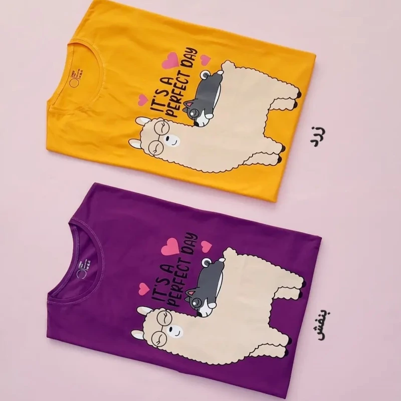 تیشرت زنانه آستين کوتاه طرح لاما جنس نخ پنبه کیفیت عالی و درجه یک تن پوش خنک و راحت در رنگ های مختلف و متنوع سایز بندی:فری سایز مناسب سایز 36 تا 44 دور سینه 104 سانت. طول لباس 68 سانت