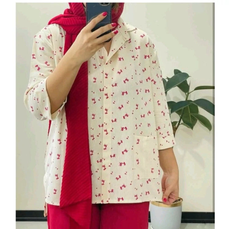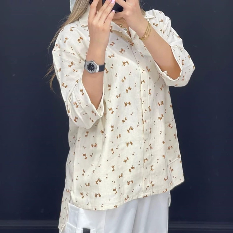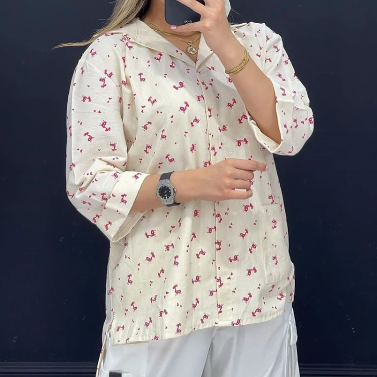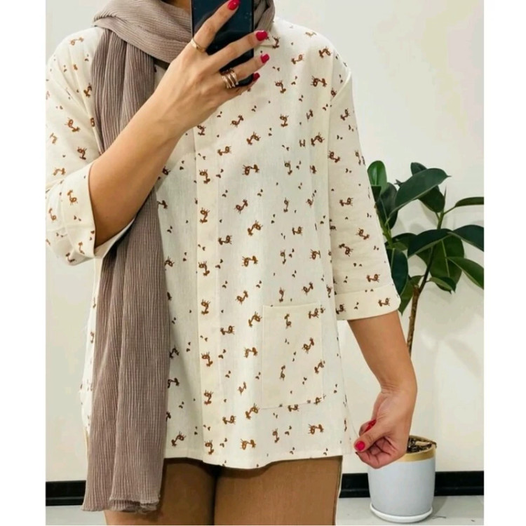 تونیک مانتویی زنانه لنین جیب دار طرح گوزن جنس لنین نچرال چاپی کیفیت عالی تن پوش شیک و زیبا فری سایز دور سینه 116 سانت. قد جلو 68.قد پشت 78